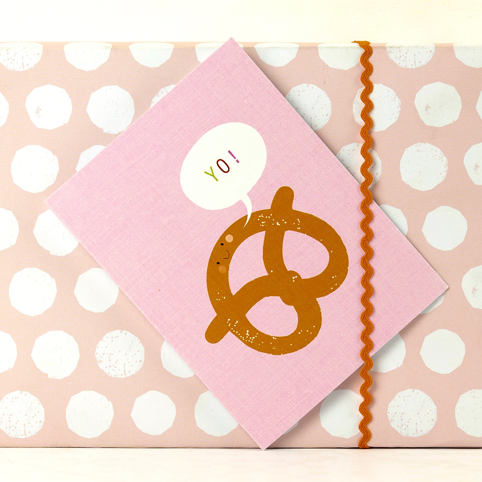 A friendly pretzel to say a big ‘yo!’ in a little card. Set on a pale pink background.